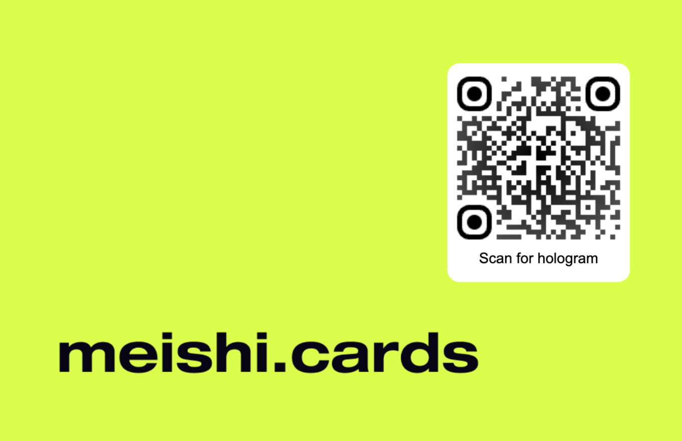 Augmented reality business card on Meishi Cards. Open this page with JavaScript enabled for the full interactive experience.